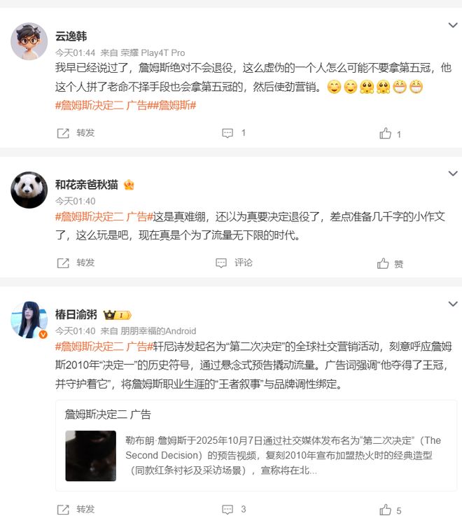 勒布朗-詹姆斯的决定一,那是在2010年夏他将天赋带到迈阿密,那也是他职业生涯第一次转会,当时是先签后换去的热火,随后他在热火拿到了两个冠军。可这个决定二却只是打广告,预热了一天就迎来这个消息?